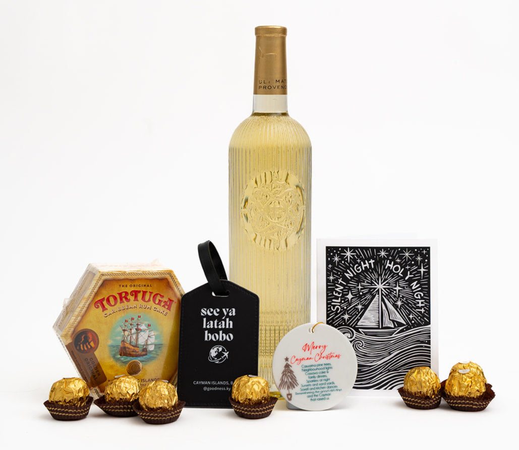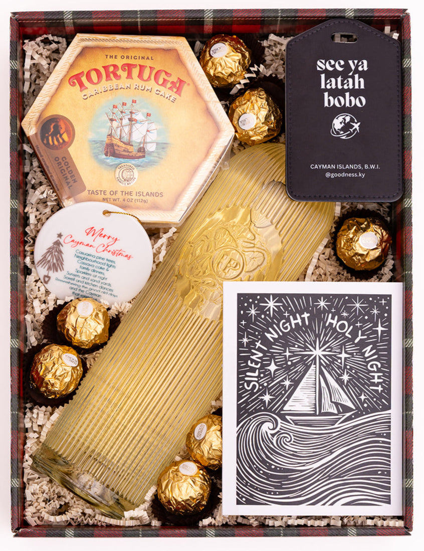 A ceramic ornament and locally designed holiday greeting card add a special Cayman touch, while Ferrero chocolates and a customizable luggage tag make it both indulgent and thoughtful.